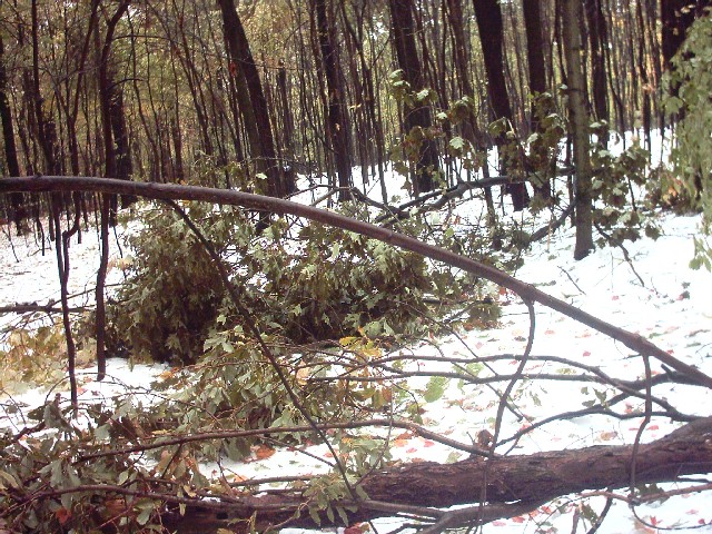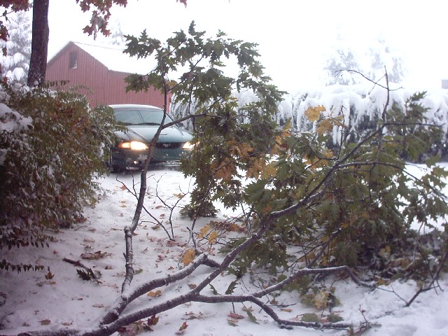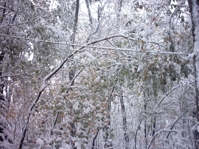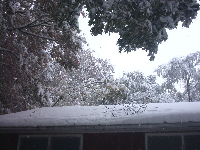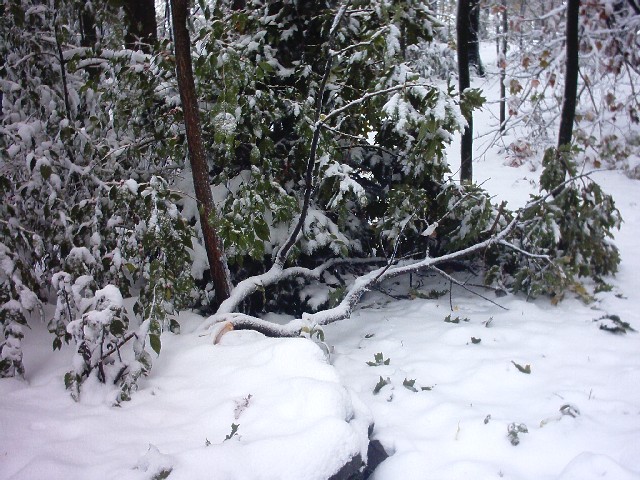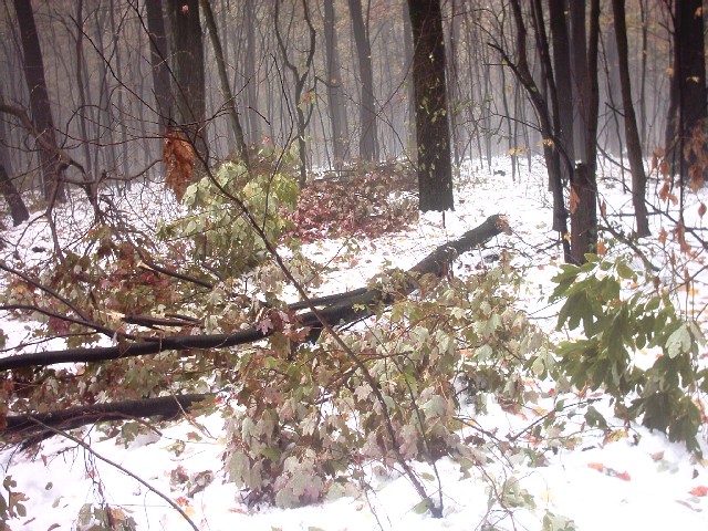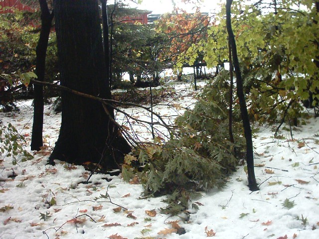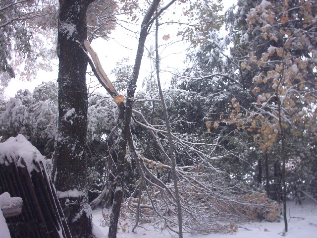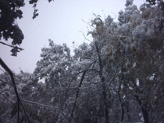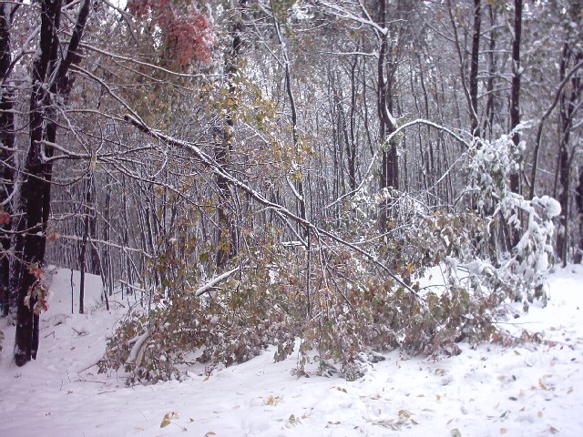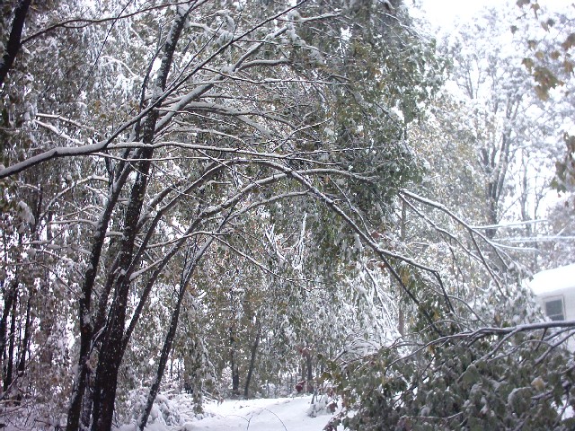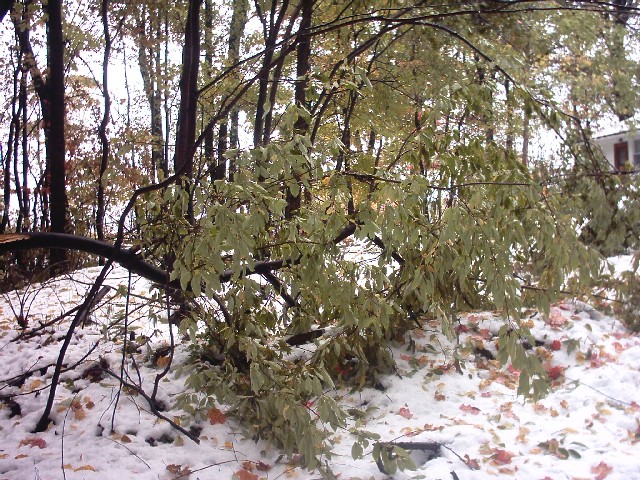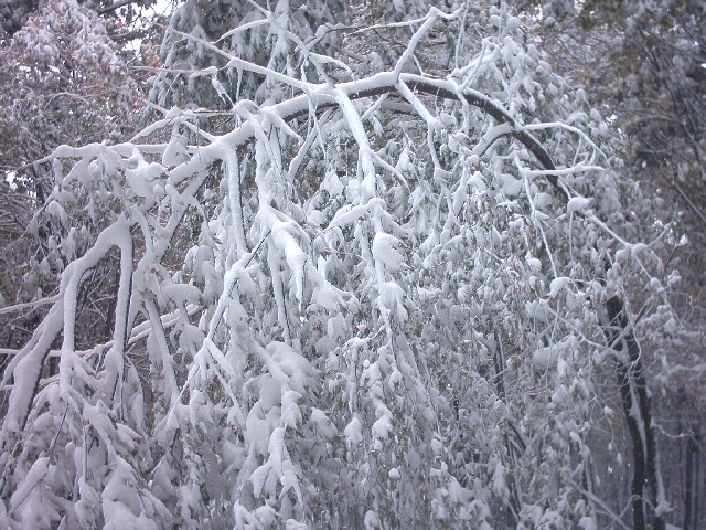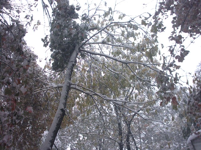 trees still had leaves on them which collected the heavy wet snow as it fell. The weight of snow on the