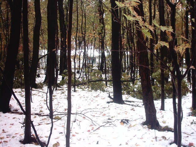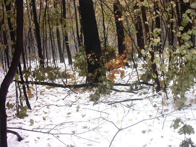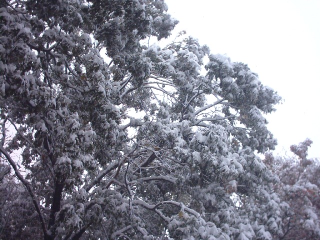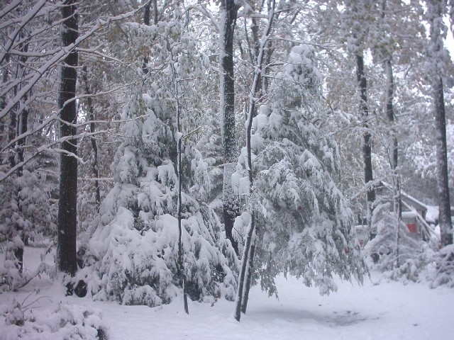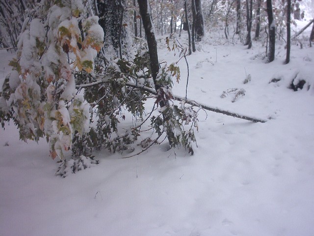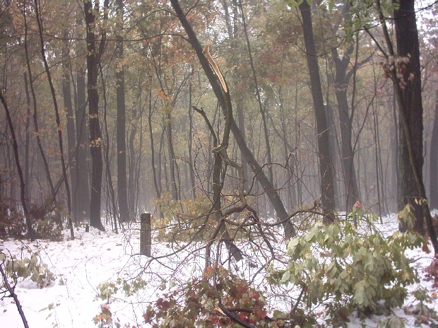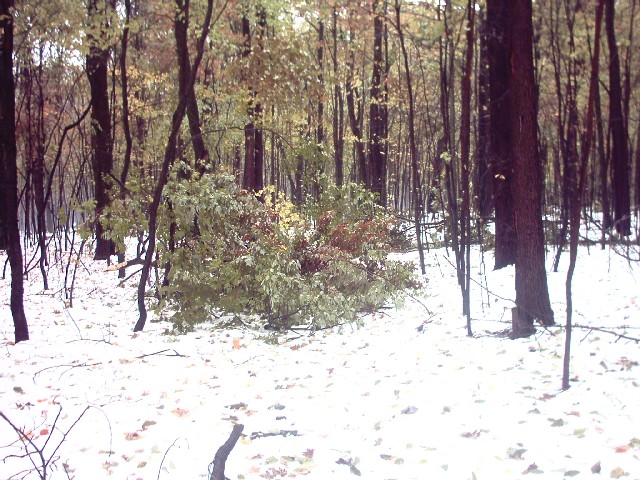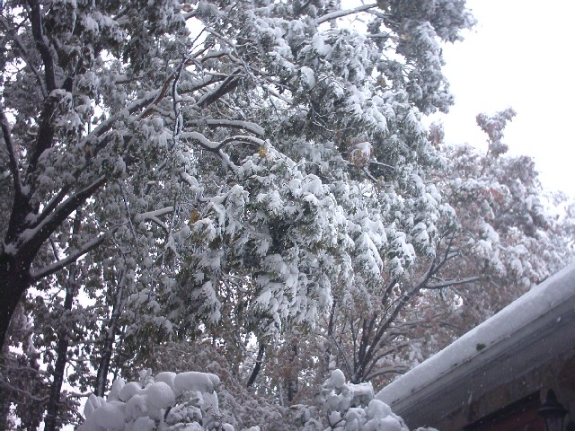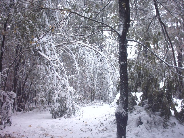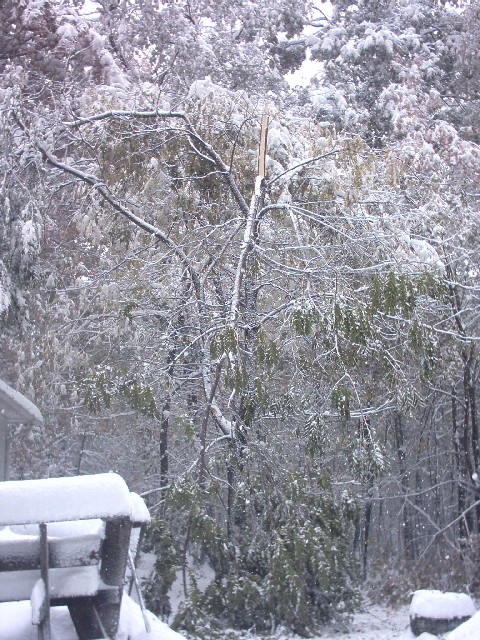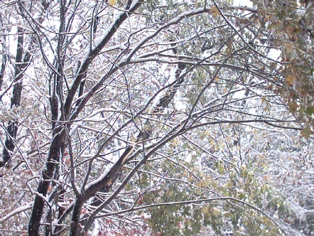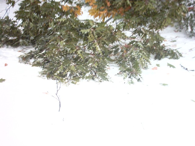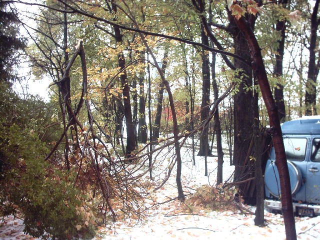 trees still had leaves on them which collected the heavy wet snow as it fell. The weight of snow on the