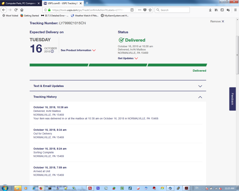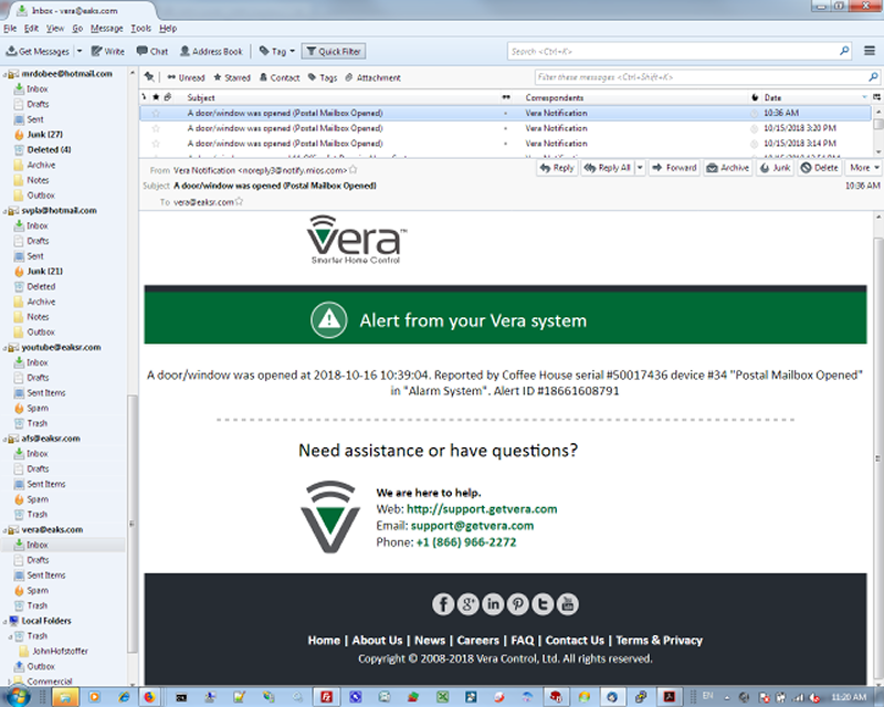 I also have installed a Vera™ Home Automation Controller at the homestead and interfaced it to my DSC Powerseries™ security system. When I installed my postal mailbox I also installed a wireless transmitter on the mailbox door to detect it being opened. I then programmed Vera to notify me by email whenever I receive "snail mail". See screen shots below of the USPS tracking of the package received and the Vera notification I got when the US Postal Employee opened my mailbox to deliver my package.